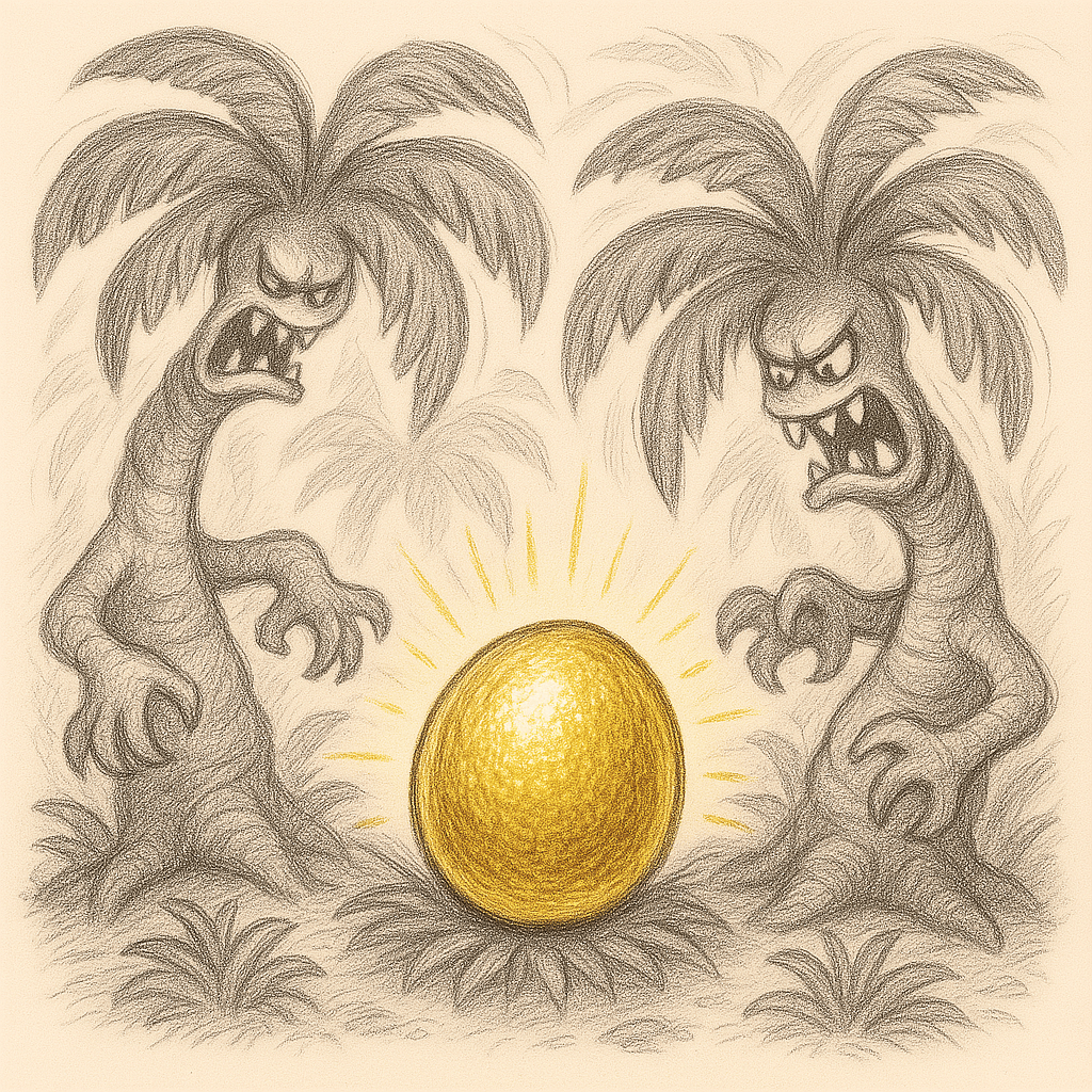 Verrückterweise kam es genau so, wie es sich der Kapitän ausgesponnen hatte. Er komponierte die verbleibenden Tage ein Stück an der Ukulele, spielte es den Palmenmonstern vor und schnappte sich, nachdem diese eingeschlafen waren, triumphierend die Goldene Kokosnuss.