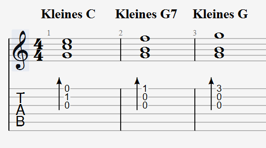 Mit den einfachen Varianten der Akkorde C, G7 und G kannst du das Stück begleiten. Streiche mit dem Daumen oder einem Plektron über die unteren drei Saiten – es ist nicht schwer. Probier es aus!